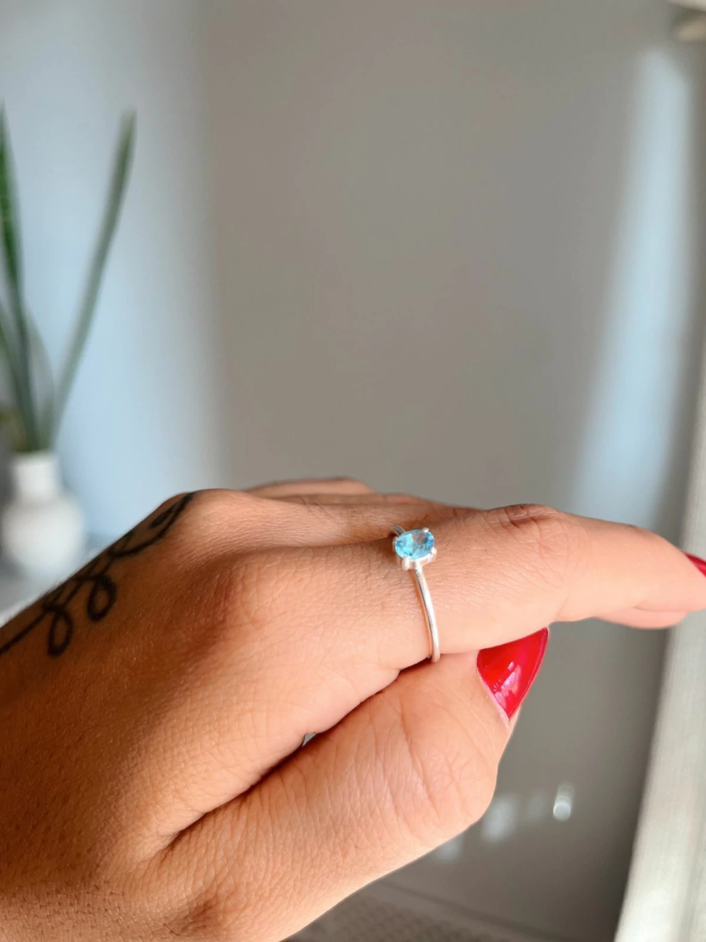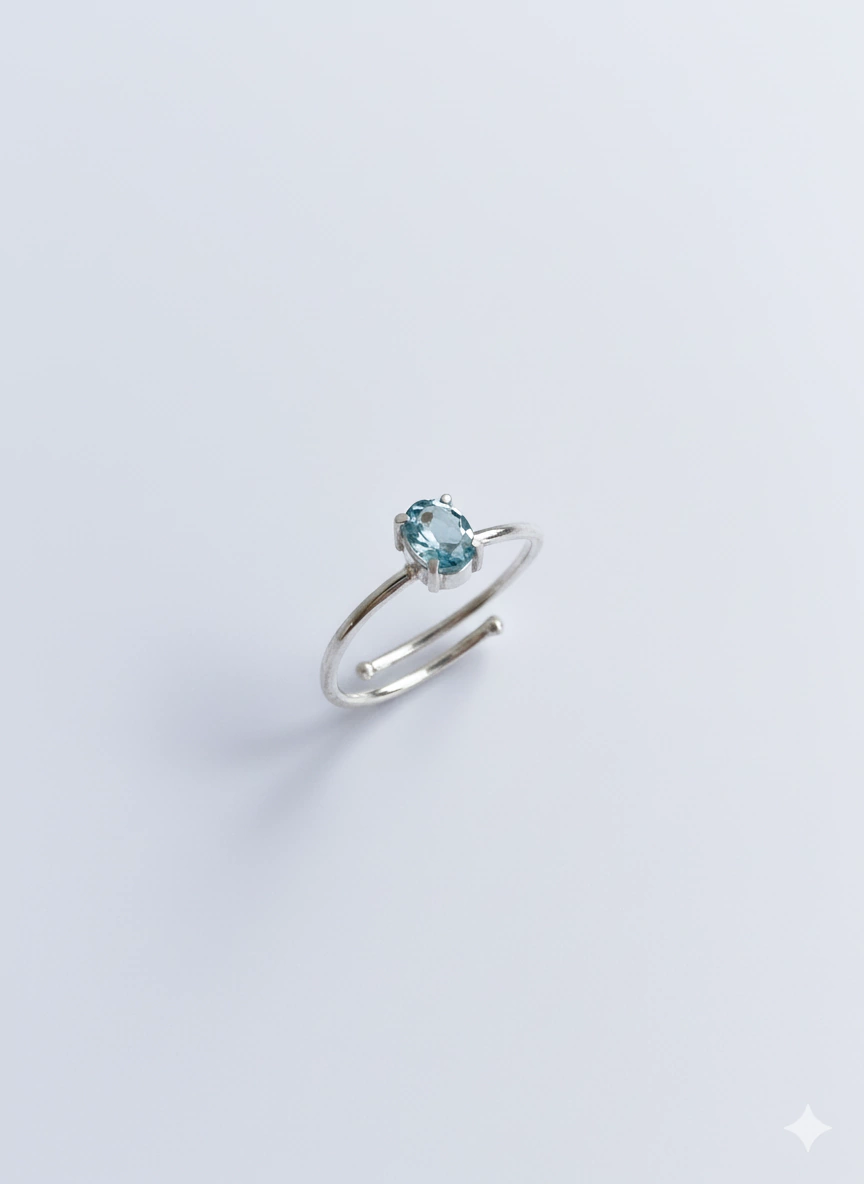 Anel com pedra na sua forma lapidada ajustável em prata 925, com crital natural Topázio Azul.