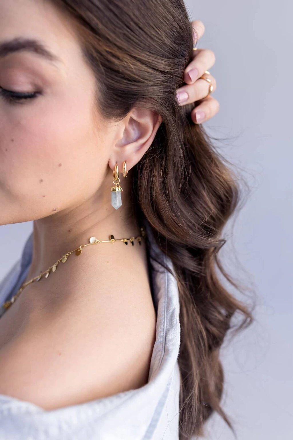 Brinco banhado a ouro 18k com ponta de água marinha.