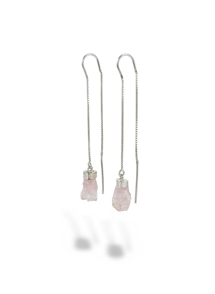 Brinco corrente única confeccionado artesanalmente em prata 925 com pedra bruta natural, quartzo rosa.