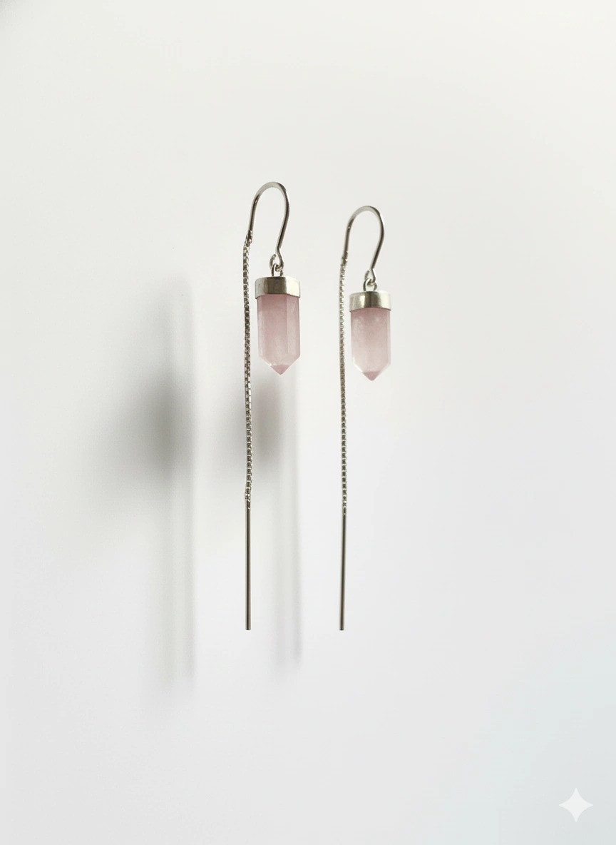 Brinco corrente única, mais curtinho na orelha, feito artesanalmente em prata 925 com Quartzo Rosa.