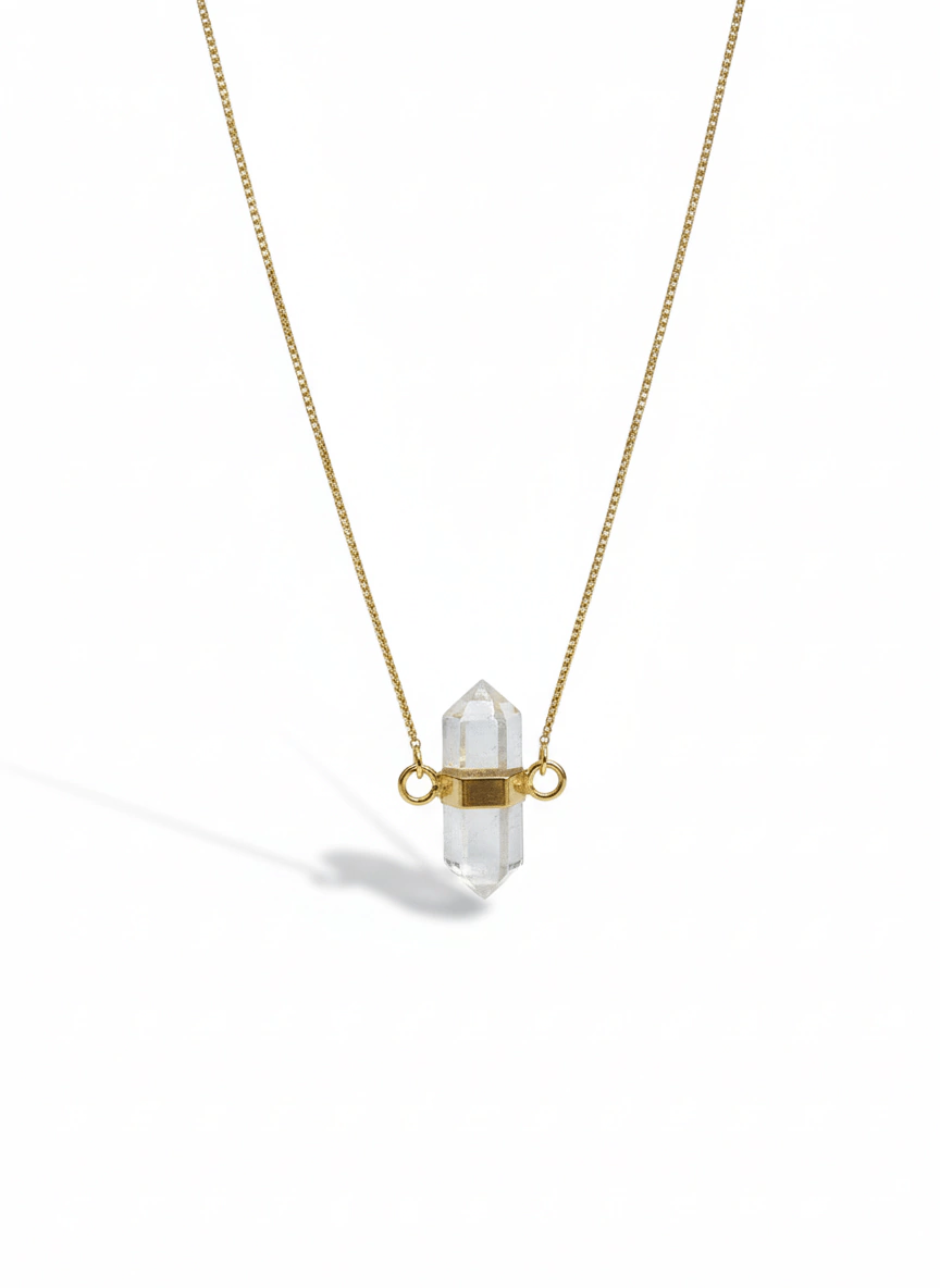 Colar de 45cm + 5cm e extensor banhado a ouro 18k com biponta de cristal de quartzo.