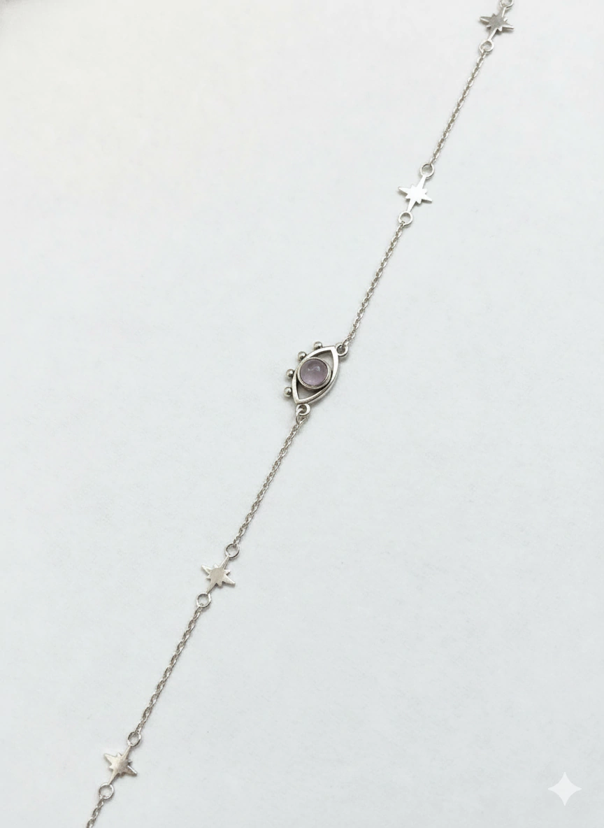 Tornozeleira com olho grego em prata 925 com quartzo rosa.